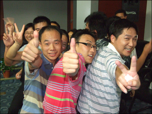 在講到“泛愛眾”這個章節(jié)時,任老師與大家分享了一個“同甘共苦”的互動游戲,他把現(xiàn)場人員分為12個組,每隊12至15人不等,大家并排站好,拼成一個緊湊的圓圈,每個隊員依次坐在后一位隊員的腿上,哪隊堅持的時間長哪隊就獲勝。開始時大家還感覺很輕松,隨著時間一分一秒的過去,疼痛感漸漸襲來,大家開始感覺體力不支,這時會議室的空調(diào)也停止運轉(zhuǎn),七月的濟南,正是最熱的時候,不一會兒,大家就大汗淋漓。