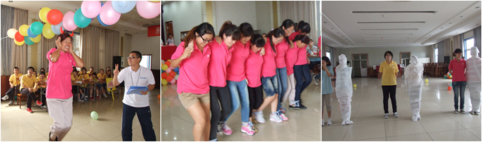 待裁判員宣讀完比賽規(guī)則后,大家都躍躍欲試,蓄勢(shì)待發(fā),活躍的氣氛到處可見。第一個(gè)項(xiàng)目是“輕松扎氣球”,要求各個(gè)方隊(duì)1名隊(duì)員參與比賽,身高限于1.6米以下的女生,參賽隊(duì)員將別有細(xì)針的發(fā)卡戴在頭上,聽到比賽口令后,用發(fā)卡頂球的方式將垂掛在天花板下方的氣球頂破,在規(guī)定的時(shí)間內(nèi),扎破氣球最多的獲勝。開始時(shí),參賽隊(duì)員沒有充分掌握比賽技巧,發(fā)夾的細(xì)針沒有對(duì)準(zhǔn)氣球,跳了幾次不得要領(lǐng),周圍助威的同事,有不斷出點(diǎn)子的,有吶喊助威的,有總結(jié)別人經(jīng)驗(yàn)的,有加緊練習(xí)的,還有捧腹大笑的,場(chǎng)面很是熱鬧。參賽隊(duì)員經(jīng)過調(diào)整,順利、公平地比完了第一個(gè)項(xiàng)目。