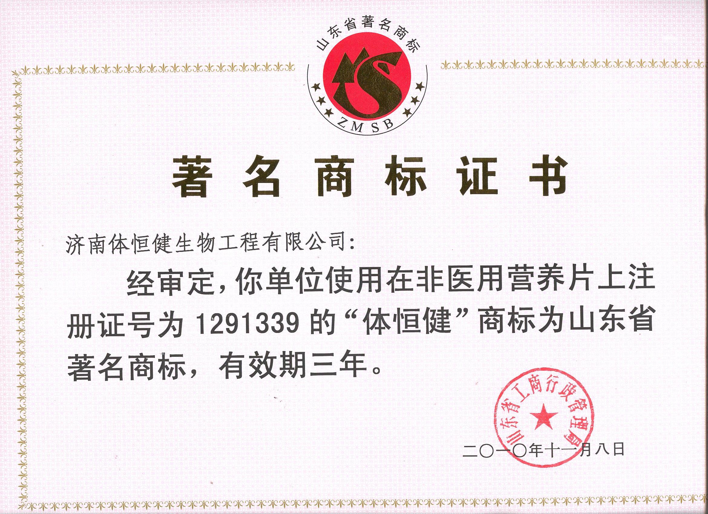 2010年,“體恒健”被 山東省工商行政管理局評(píng)為“山東省著名商標(biāo)”