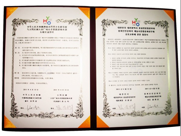 大會(huì)第二階段為簽署交流合作協(xié)議。致辭結(jié)束后,湯會(huì)長(zhǎng)代表濟(jì)南市傳統(tǒng)文化研究會(huì)與韓國(guó)大田廣域市孝實(shí)踐運(yùn)動(dòng)本部會(huì)長(zhǎng)吳元均先生簽署了兩個(gè)民間團(tuán)體之間的合作協(xié)議。按照協(xié)議規(guī)定,在未來(lái)的幾年中,兩會(huì)之間將加強(qiáng)交流與互訪,共同推動(dòng)孝文化的研究、實(shí)踐、推廣與傳播。研究會(huì)副會(huì)長(zhǎng)兼秘書長(zhǎng)趙衛(wèi)東、副秘書長(zhǎng)鄭朝霞、彭耀光、戴佐義以及部分會(huì)員參加了簽署儀式。