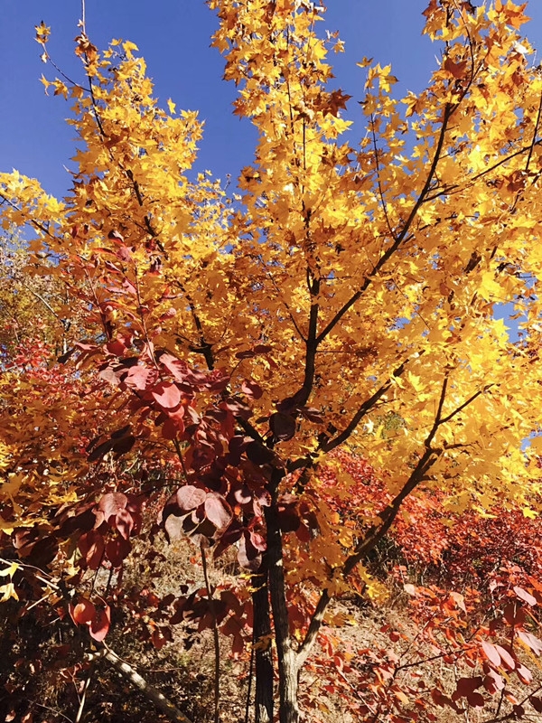 金秋時分,沿著山脊邊走邊欣賞紅葉,在山頂眺望紅葉谷別有一番景色。此時紅葉谷換上了富麗的盛裝,層林盡染,深淺相間,翠綠、橙黃、殷紅,相互交織,錯落有致,令人眼花繚亂。