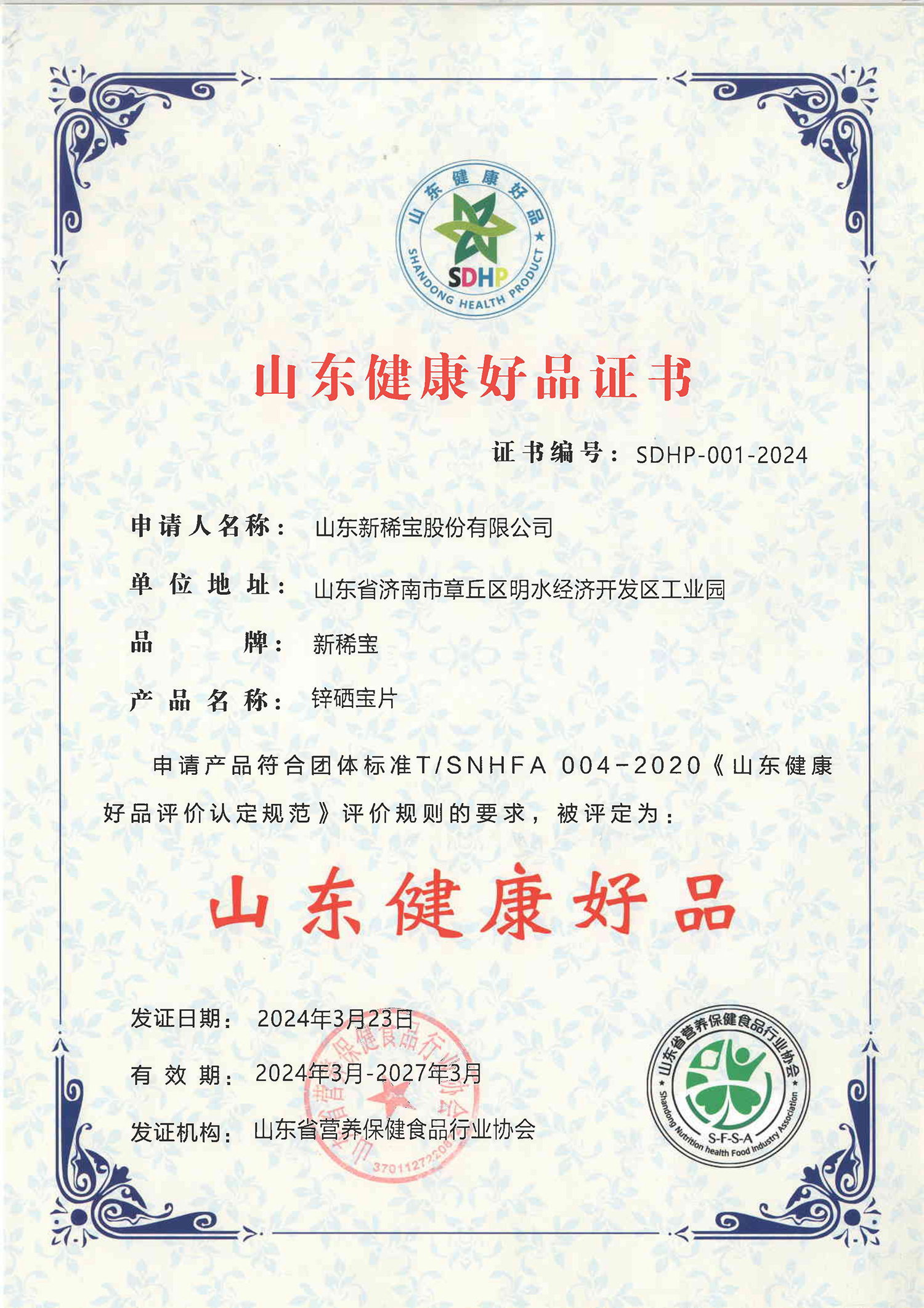 2024年3月23日,山東省營養(yǎng)健康產(chǎn)業(yè)高質(zhì)量發(fā)展論壇在青島順利舉辦,會上公布了第二批山東健康好品獲獎(jiǎng)名單。其中,新稀寶集團(tuán)旗下產(chǎn)品“鋅硒寶片”被二次授予“山東健康好品”的稱號。